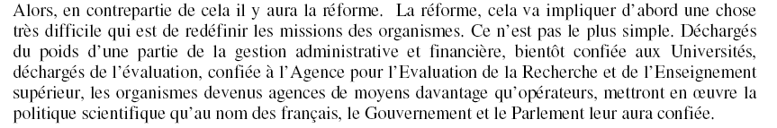 Instrumentalisation de la rechercheOn connaît les termes du débat : inutile d'y revenir ! On connaît également les forces en présence : elles se sont fait connaître lors du vote de la loi Pécresse. Même inspiration -libérale - derrière le constat en lui-même juste de l'indigence dans laquelle on a laissé l'université française, que ce soit dans son versant enseignement ou dans celui de la recherche. Quand on n'a pas d'argent à mettre dans le pot, on botte en touche, du côté de la réforme de structure .Que signifie agence de moyens? Que signifie mettre en œuvre une politique de recherche définie par le gouvernement? On retrouve ici le problème central du politique en bonne règle démocratique qui doit évidemment primer sur le technique. De ce point de vue, il n'y a rien à redire : l'autorité publique est comptable de l'argent public, il est donc logique qu'elle veille à son utilisation. Est-ce à dire qu'elle doive pour autant en définir la politique? et jusqu'à quel point de précision ? Le risque est énorme qu'on en vienne à confondre science et technique et qu'on ne privilégie, dans la recherche, non point tant la connaissance que l'efficacité, qu'on réduise en tout cas la recherche à la recherche appliquée en négligeant la recherche fondamentale. Les exemples sont trop nombreux dans l'histoire des sciences de grandes découvertes faites hors de toute préoccupation pratique pour qu'il soit utile de les souligner. Il est tout à fait prévisible que le gouvernement s'attende à des résultats et ce d'autant plus que l'actuel président est entiché de cette culture managériale du résultat. Il n'y a qu'à se souvenir de la volonté d'évaluer les ministres !!! Il est donc tout à fait prévisible que l'on privilégie la recherche appliquée - et que dire de la recherche en sciences humaines dont on voit difficilement les utilisations immédiates.... Il ne s'agit pas pour autant de défendre le système actuel, qui n'est pas parfait, mais simplement d'anticiper une dérive qui risque bien de soumettre la nécessaire liberté des chercheurs aux impératifs de la stricte nécessité publique - et de l'efficacité immédiate. Au delà de toute considération politicienne, il faut simplement admettre que :