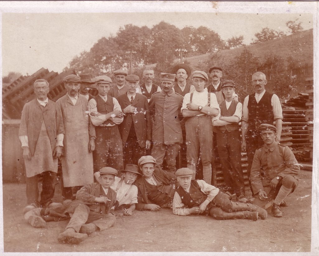 On le voit ici, en bas à gauche, sur cette photo, trop vite grandi, la cigarette à la bouche comme pour mieux trahir cette enfance volée. Photo d'un autre âge, où les hommes sont tous moustachus, tous nantis d'une casquette, marque presque obligée de la condition ouvrière, où le sabot est plus fréquent que la botte et surtout la chaussure !